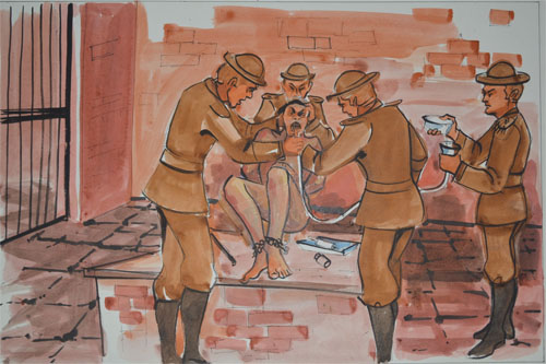 the milk from his mouth through his nose. The jail officials then cut opens his veins of the